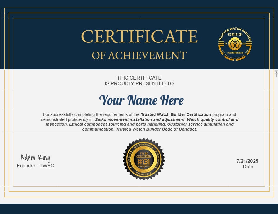 With the Trusted Watch Builder Certification (TWBC) program, you’ll gain the skills, credibility, and connections to take your watch building and modding to the next level.